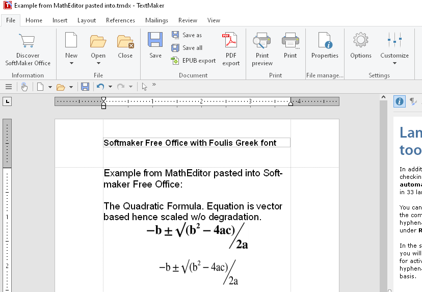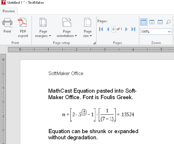 MathEditor equations are vector represented, and may thus be copy/pasted into compatible world processors with fully scalable results as shown within SoftMaker Office below in Figure 6.