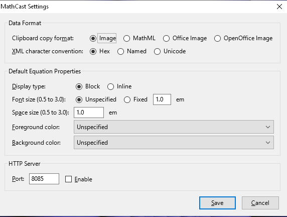 The "save" command allows equation sets to be saved as image, MathML, Office Image or as OpenOffice formats per the "settings" panel Figure 3.